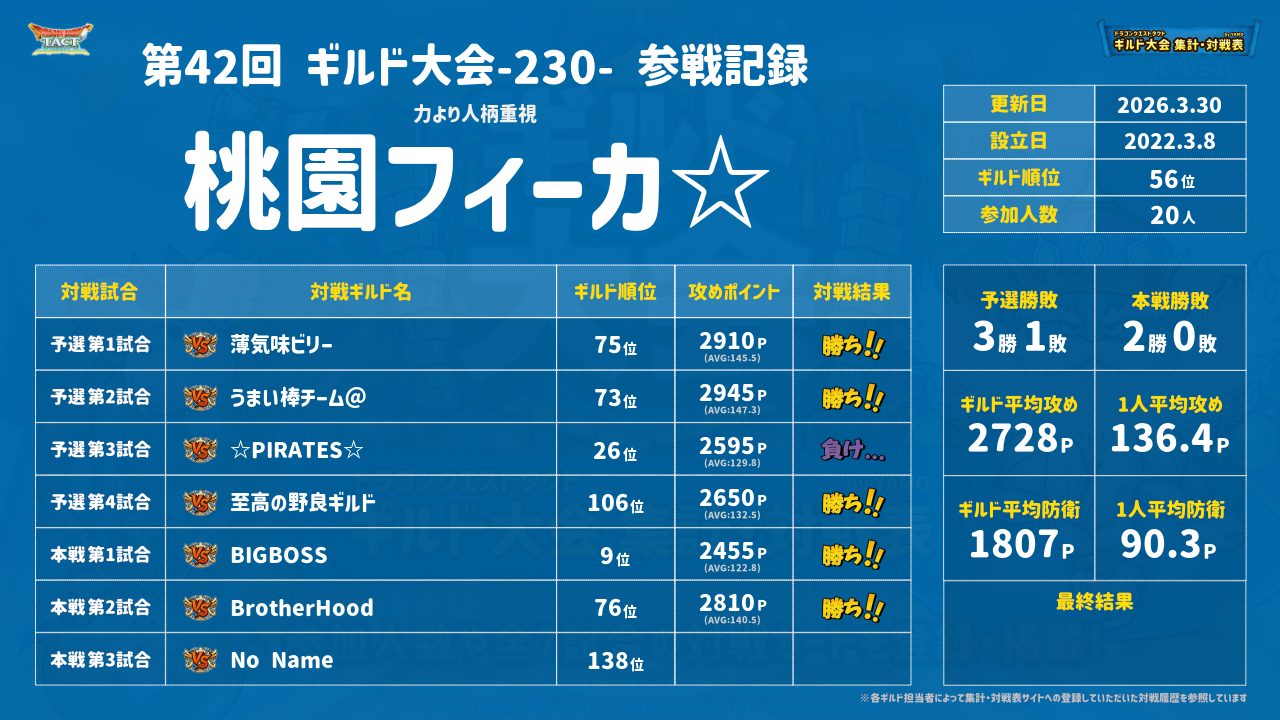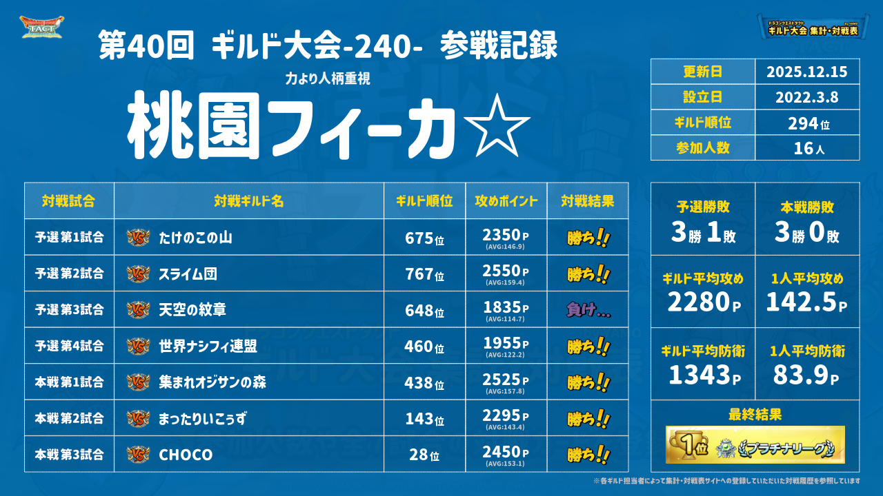 | 紹介文 | 2022/10/01から再始動(ギルマス交代:ムンタ) 当ギルドはガチャ煽り禁止で、手持ちの中でどう戦うかを一緒に考えていくスタイルです。 基本的にノルマなどはありません。 ソロプレイはあまり干渉せず、ギルド協力必要なギルド大会などはしっかり連携を取って楽しくプレイを心掛けてます。 (日々大変かと思うので各自プライベート優先いただきつつ) 仲間を大切にストレスなくゲームを楽しめる環境を目指して運営しております! |